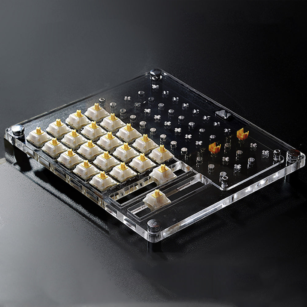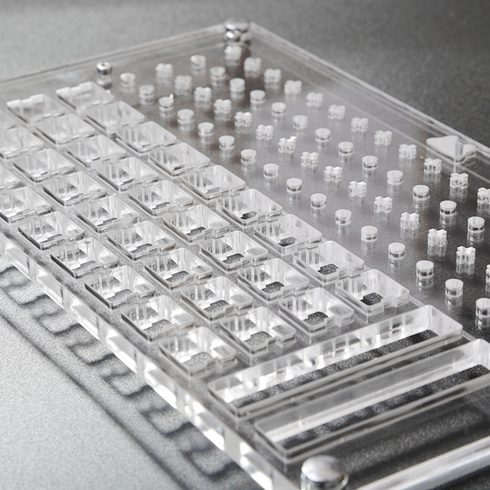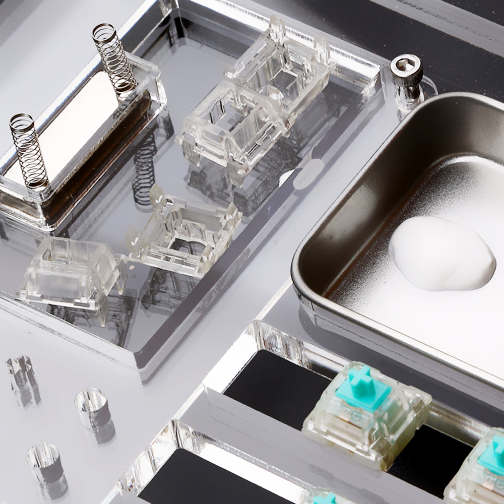 The Lube Station is designed and reasonably divided by different areas for switches, *stems and springs. With the Basic version, it applies to the MX switches but also has vertical lines for the Box switches. With the Professional station, it also comes with a magnetic area for placing springs and other metal parts, so no worries for losing them.